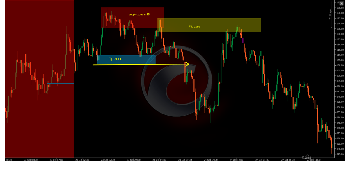 درشکل زیر در ناحیه ی عرضه ی یک تایم بالا هستیم (قسمت قرمز بزرگ) حال با ایجاد یک فیلیپ در تایم 15 دقیقه ی